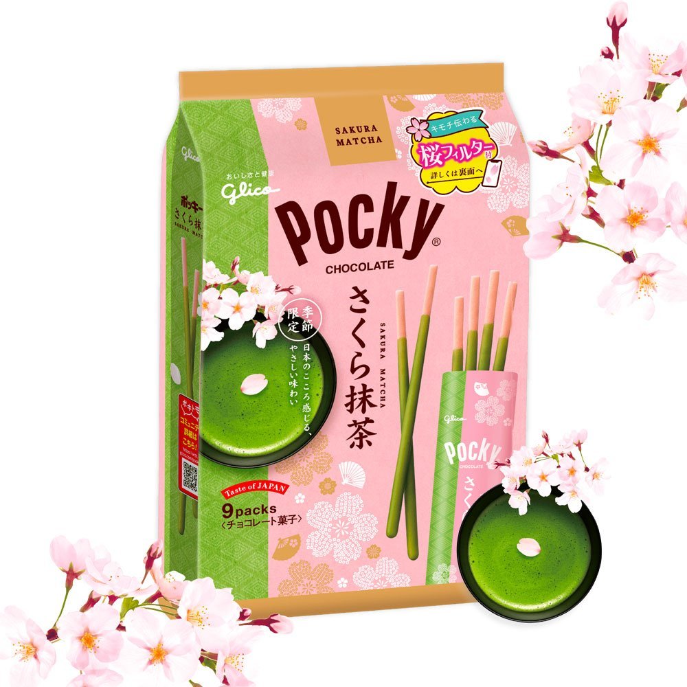 Glico Pocky Sakura Matcha Chocolate to Paluszki Glico o smaku matchy i kwiatu wiśni bardzo chrupiące i popularne (8 torebek)